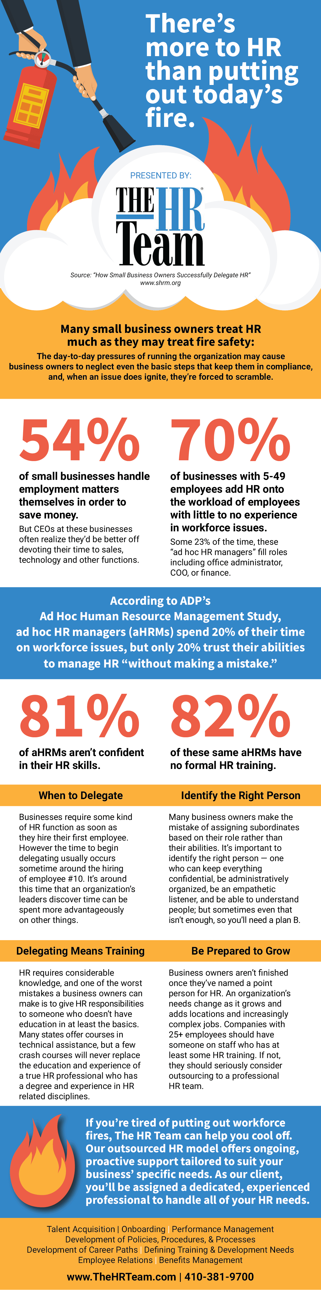 The HR Team takes a closer look at how small business owners can successfully delegate HR, and when it may be time to outsource. Click to download a PDF of the Infographic below.