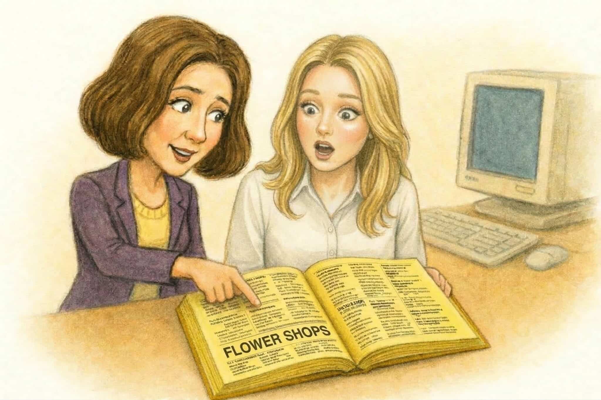 Three hours later, she came back and said she had been looking and looking but just couldn’t find the florist’s number on the Internet. Since it was 1999, I asked, “Did you look in the phone book?”